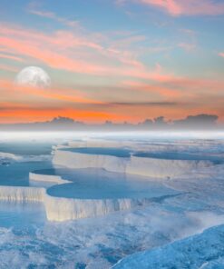 Pamukkale nổi bật với các tầng thác trắng như bậc thang đá vôi phủ nước xanh ngọc bích, hình thành nhờ suối nước nóng chứa nhiều khoáng chất